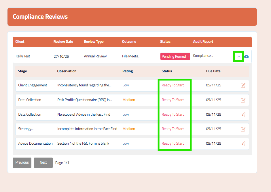 You will notice a new Compliance Review with the status of ‘Pending Remediations’. This is the review that requires your attention.