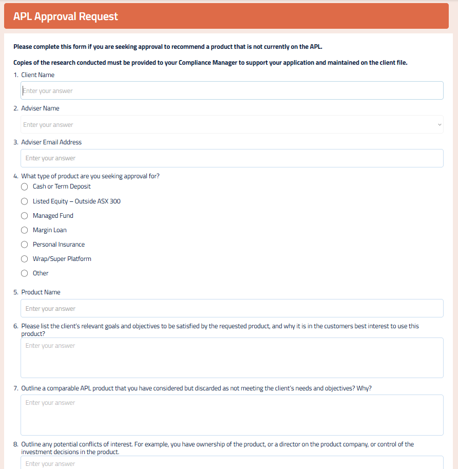This will notify your Compliance Manager of the new APL Request. Your Compliance Manager will review the request and notify you of any further questions to process the approval.