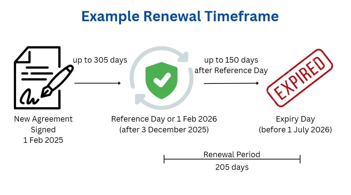 If your client entered into an ongoing fee arrangement on the 1st March 2025, you can renew the agreement at any time between 31 December 2025 and 29 July 2026.