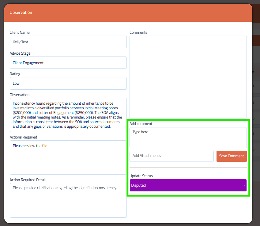 Add a comment in the observation and upload any support documentation. Update the status of the observation to ‘Disputed’.